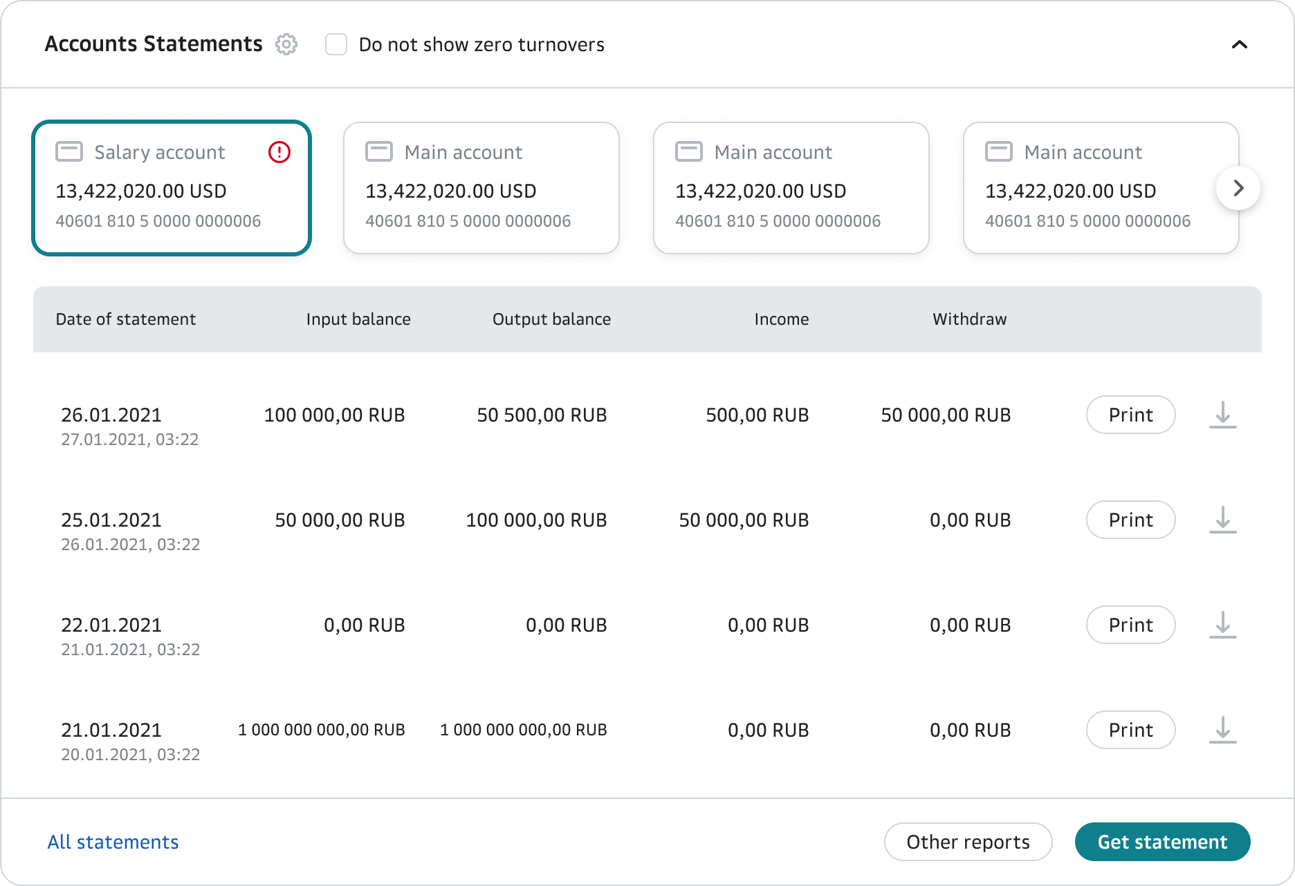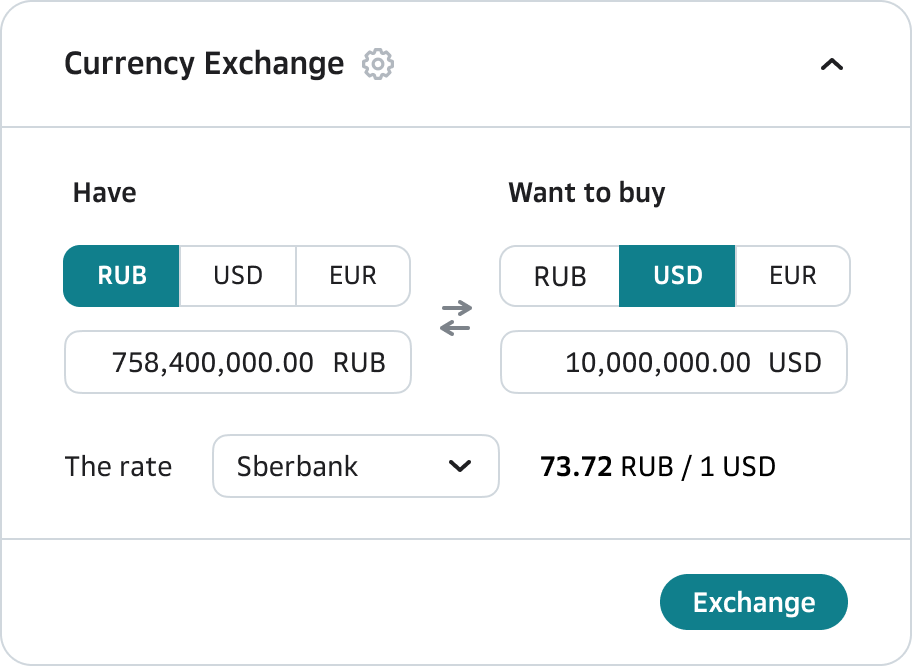 It was decided to create dashboards similar to those of other industries. These dashboards will reflect the three key scenarios of large business users: liquidity management, currency exchange and salary payments. To achieve this I designed series of widgets and a variety of layout compositions.